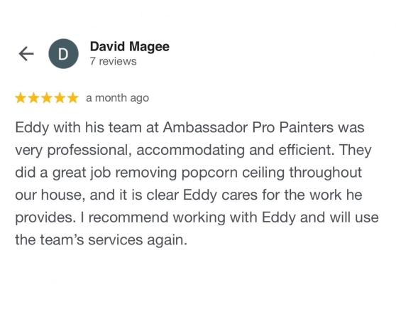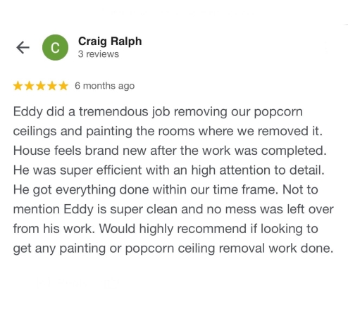 After the popcorn ceiling removal, skim coating, priming, and painting are complete, we finish with a thorough cleanup, leaving your home spotless and your ceilings perfectly smooth.
