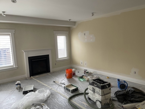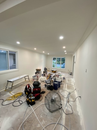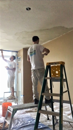 Once the skim coat is complete, we sand the ceilings again, apply primer, and finish with a professional paint job for a flawless look.